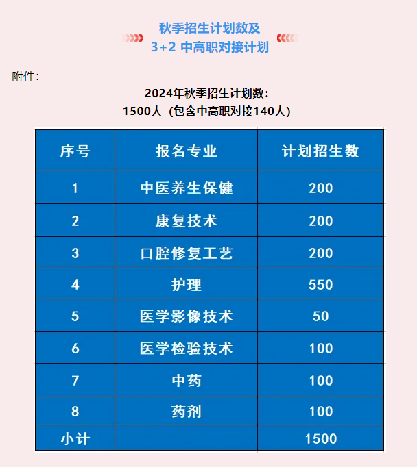 中医养生保健、康复技术、口腔修复工艺、护理、医学影像技术、医学检验技术、中药、药剂全部八个专业,每专业2750元/学年,教材费(每学期约420元)等据实收取,住宿费300元/学期。