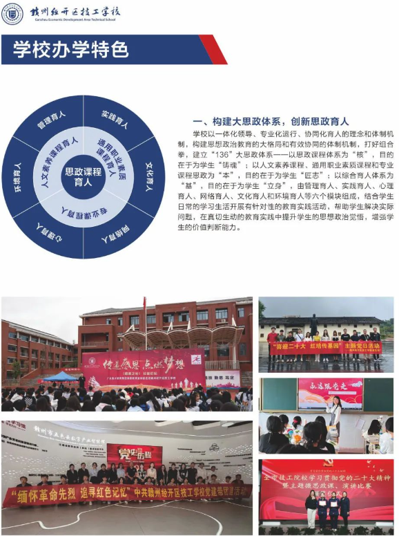 贛州经开区技工学校是赣州市属国有企业——赣州建控集团创办的技工学校,学校坐落于新能源汽车科技城,为赣州经开区重点打造的技工院校。学校占地63余亩,校舍建筑面积约40000平方米。建有标准的运动场所和综合性运动场馆;住宿为6人标准间,配备空调、热水器等设施。教学设备设施齐全,校园环境一流。学校师资力量雄厚。学校依托国企优势,按照“质量立校、人才兴校、特色强校"的办学思路,计划立足中级技工教育的基础上争取3年内提级升格,升级为 “赣州经开区高级技工学校”,争取5年内再次提升办学层次,升级为“赣州经开区技师学院",发展成为综合性技能型人才的培养院校。在持续办好赣州经开区技工学校的基础上,赣州建控集团组建了“赣州经开区职业教育集团控股有限公司"。通过市场化手段筹措资金,全力推进建设“赣州经开区产教融合园”,打造一座占地约300亩的“1+N”(一个核心校区,若干个功能教学点)职业教育园区,以期实现涵盖技师、高级技工、中初级技工的万人技校。