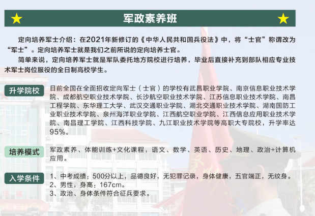 培养模式 军政素养、体能训练+文化课程,语文、数学、英语、历史、地理、政治+计算机 应用。