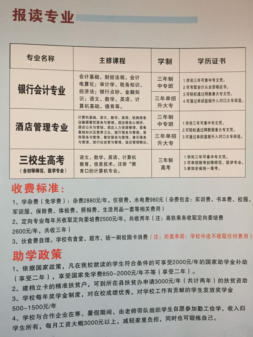 1、学杂费(免学费):杂费2880元/年,住宿费、水电费980元(杂费包含:实训费、书本费、校