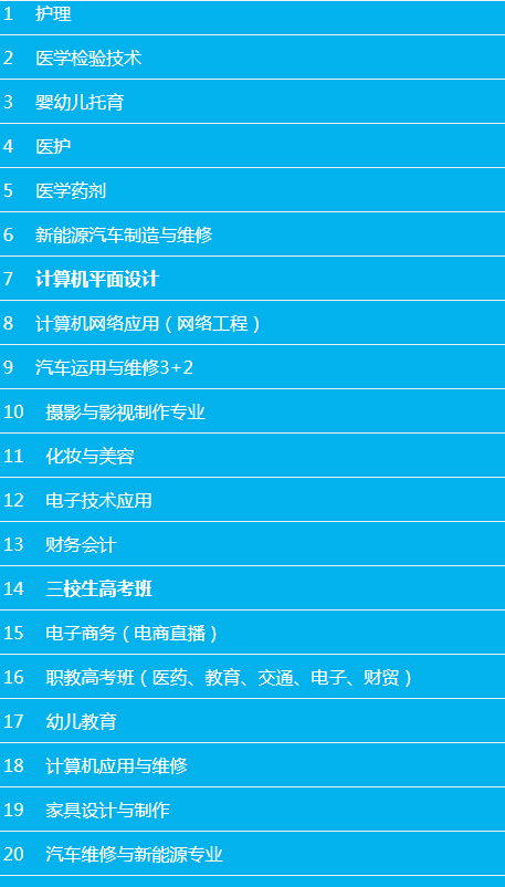 5、中职:幼儿托育、医护、药剂、医学检验技术、汽车应用与维修、计算机平面设计、计算机应用。